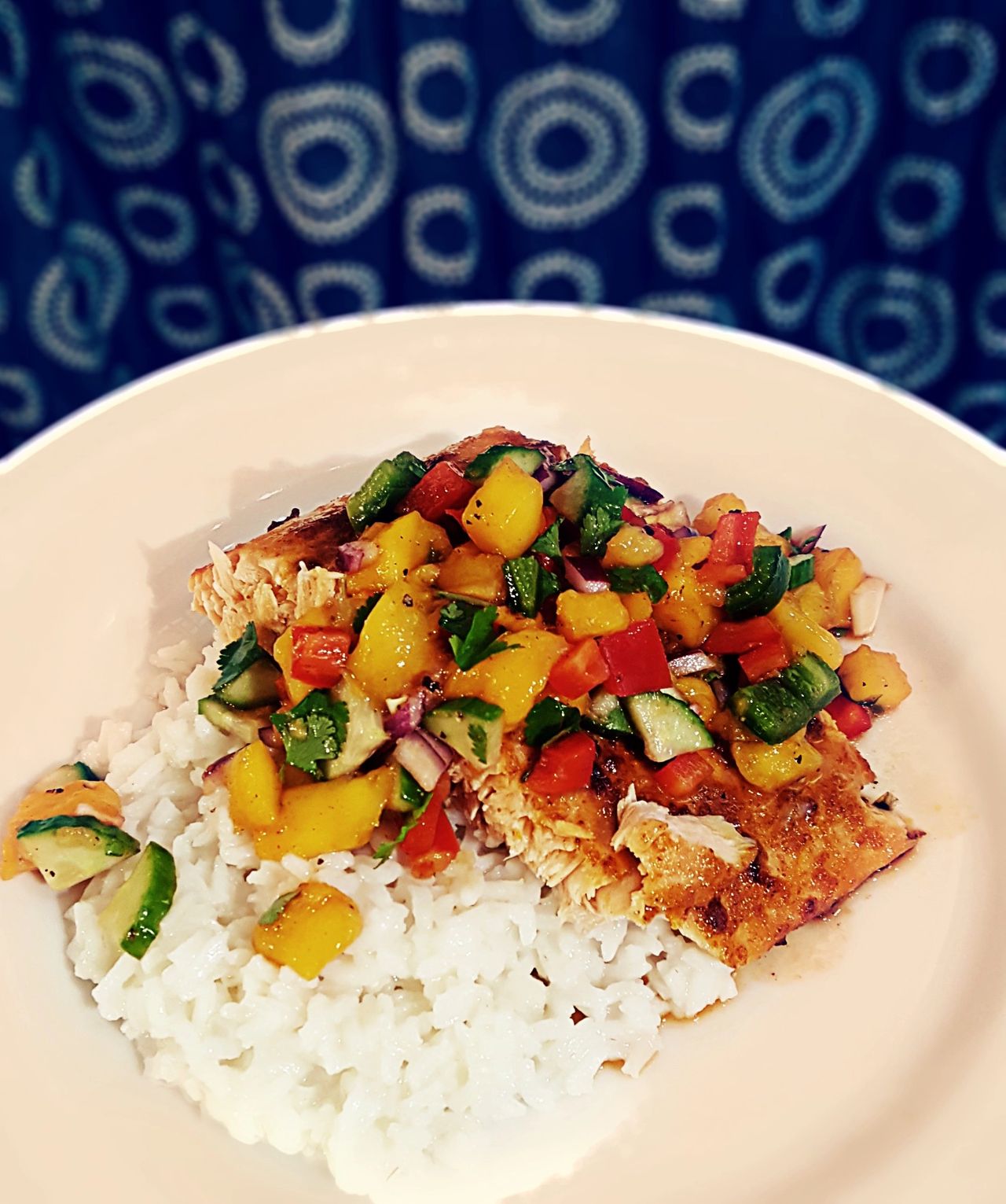 Time to plate!! Scoop Coconut Rice on plate. Cut your Salmon into filets and place one filet on rice. Top with Mango salsa. Enjoy this healthy, energy packed, feel-good meal. Absolutely delicious!