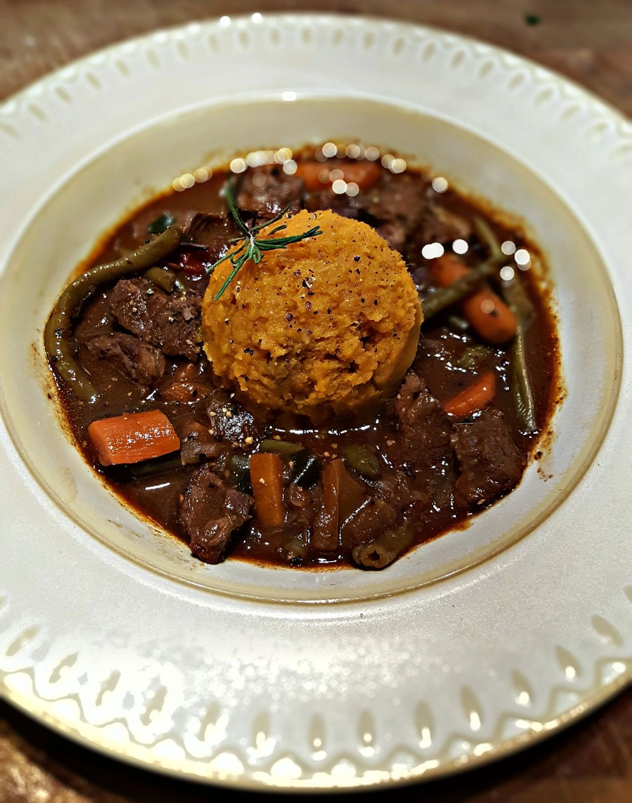 While the stew cooks, peel the sweet potatoes, cut into chunks and boil in a pot for 10-15 minutes in water until tender. Drain and add back to pot. With a potato masher, mash sweet potatoes. Add 4 TBS butter, Orange Rum Vanilla Turbinado, Cinnamon and stir. To serve ladle stew in bowl. With an ice cream scoop, fill scoop with sweet potato mixture and gently place scoop in center of stew. Garnish with fresh rosemary and fresh ground pepper. Grab a beer, a blanket and pile up by the fire. Slurp until your heart's content.