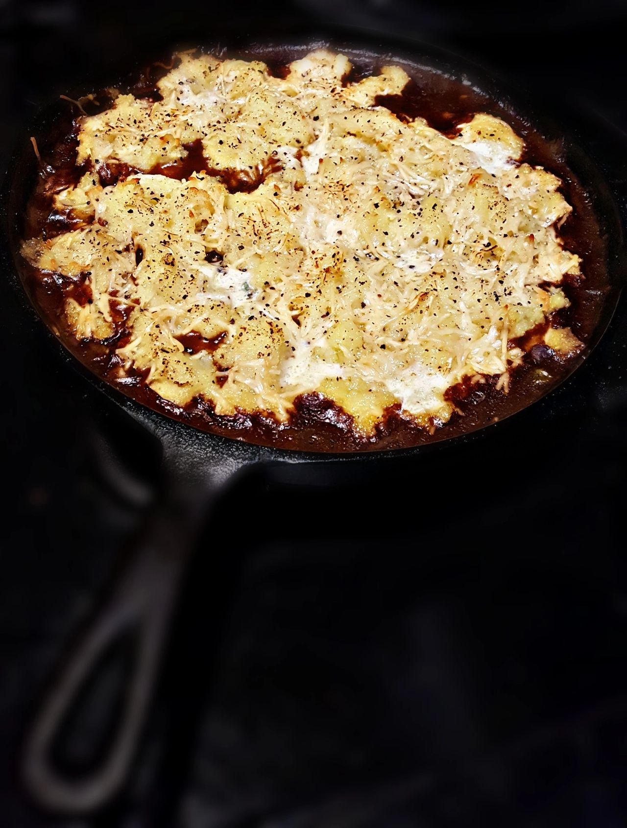 Once lamb mix has simmered for 20 min dollop mashed potatoes on top and spread around the best you can. Next, spread shredded parmesan cheese and 4 TBS of Irish Butter on top and grind some fresh ground pepper on top of the cheese. Place skillet on a cookie sheet and place in oven.